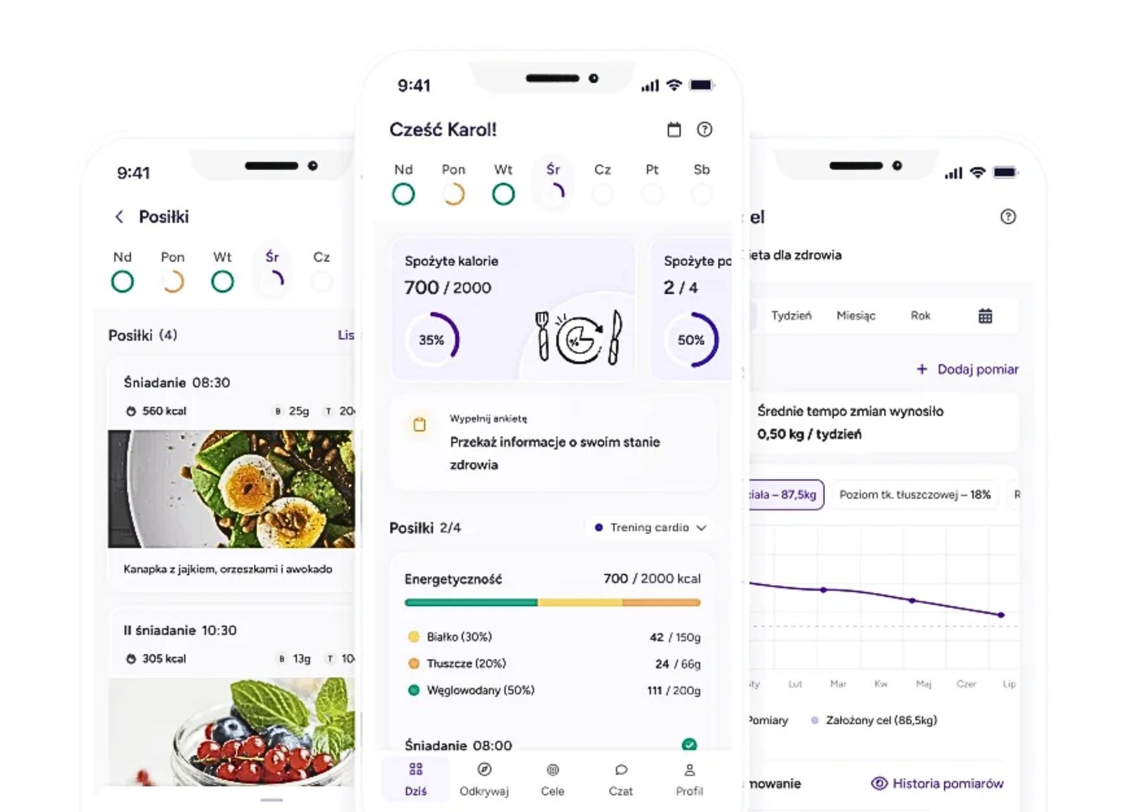 Współpraca wspierana jest najnowocześniejszą aplikacją dietetyczną na rynku z natychmiastowym dostępem do zaleceń oraz czatem z dietetykiem, co umożliwia bieżący kontakt i szybkie reagowanie na potrzeby pacjenta.